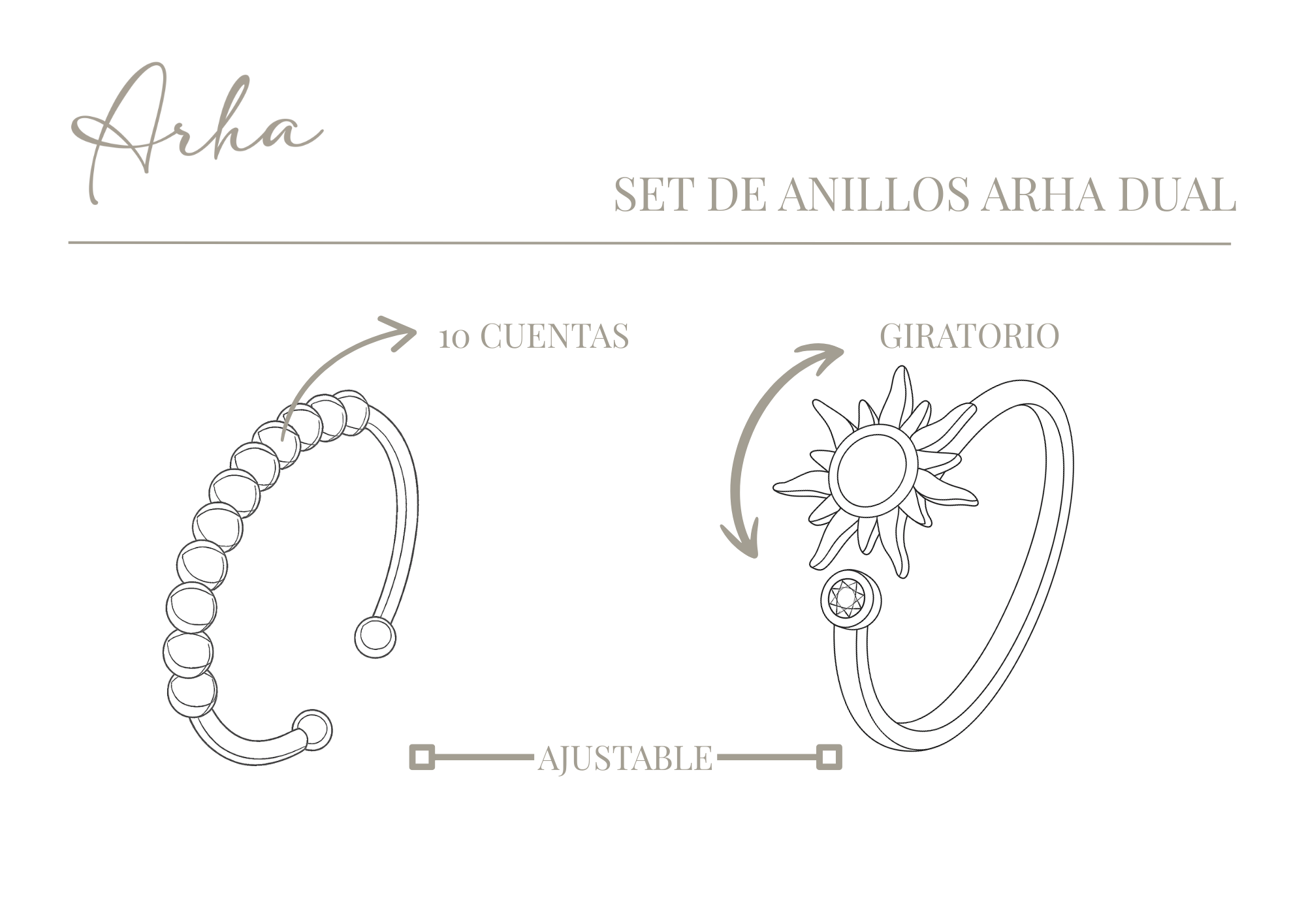 El Set de Anillos Arha Dual combina dos piezas únicas diseñadas para brindar elegancia y bienestar emocional en tu día a día. Incluye el Anillo Sol, símbolo de energía y vitalidad, y el Anillo Diez Cuentas, creado para fomentar calma y equilibrio a través de un diseño consciente.